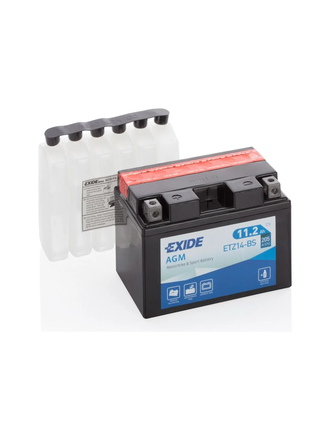 EXIDE ETZ14-BS — мотоакумулятор типорозміру YTZ14-BS. Його часто обирають як заміни EXIDE YTZ12-BS з кращими характеристиками, коли потрібен впевнений запуск і більший запас по навантаженню. Модель має ємність 11,2 Ah та пусковий струм 205 A, що допомагає стабільніше запускати двигун у холодну погоду, після простою та при активному використанні електрообладнання.